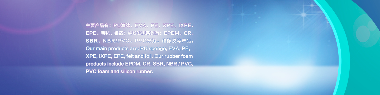 主要產(chǎn)品有:PU海綿、EVA、PE、XPE、IXPE、EPE、毛氈、鋁箔;橡膠發(fā)泡系列有:EPDM、CR、SBR、NBR/PVC、PVC發(fā)泡、硅橡膠等產(chǎn)品。提供卷材、片材、管材、沖壓切割成型、復(fù)合成型、材料上膠。